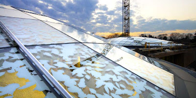 El público ve desde las terrazas que bordean las cúpulas externamente, mientras un paseo inclinado dirige hacia abajo en un espacio educativo, estudiando los cercos por el camino.